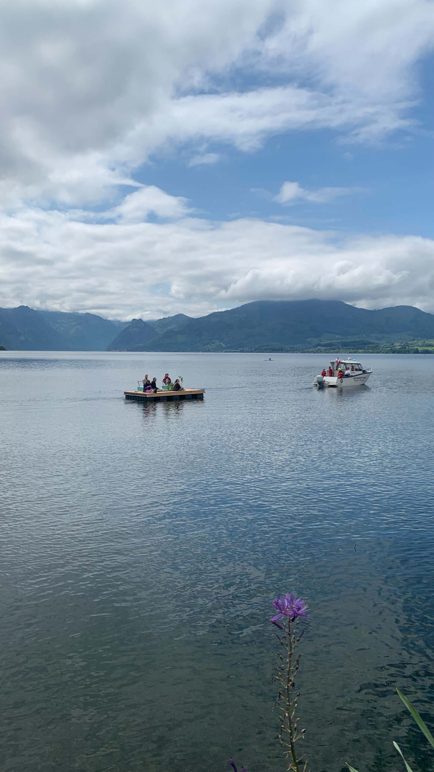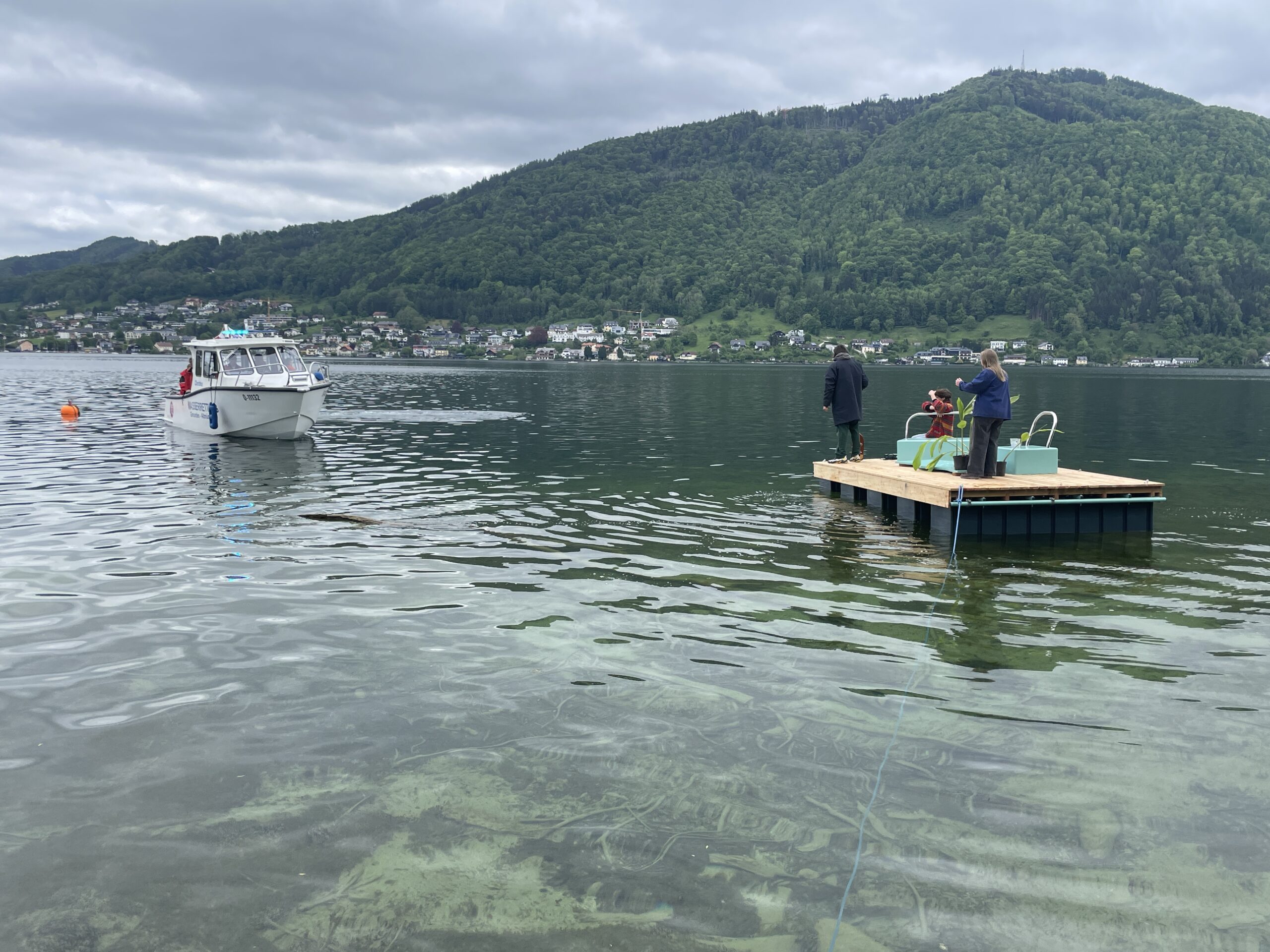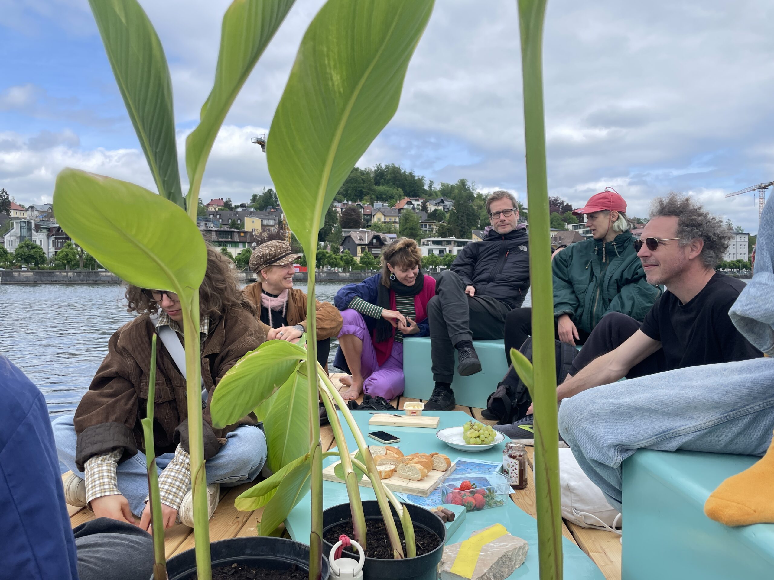 Zwei weitere schwimmende Plattformen wurden kollektiv zu Wasser gelassen. Sie sind ein neuer Raum am See, der in Zukunft für Ausstellungen, Performances, Kunst- & Kulturveranstaltungen genutzt werden wird. Eingeweiht wurden der Raum am See mit einem gemeinsamen Picknick, das über den Traunsee wanderte.