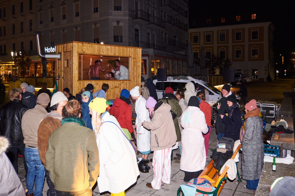 *Der Urban-Sauna-Club bringt seine mobile Sauna in den öffentlichen Raum und fordert das Gewohnte heraus. Zwischen Asphalt und Himmel entsteht ein Ritual der Gegensätze – Hitze und Schweiß trifft auf kalten Boden- Intimität trifft auf Anonymität. Ein Raum der Begegnung, geschaffen überall dort, wo Verspannungen gelöst werden wollen. (Roman Neuhauser/Emil Neuhauser /Paul Reisenberger/Leonhard Keiblinger/Lorenz Keiblinger)