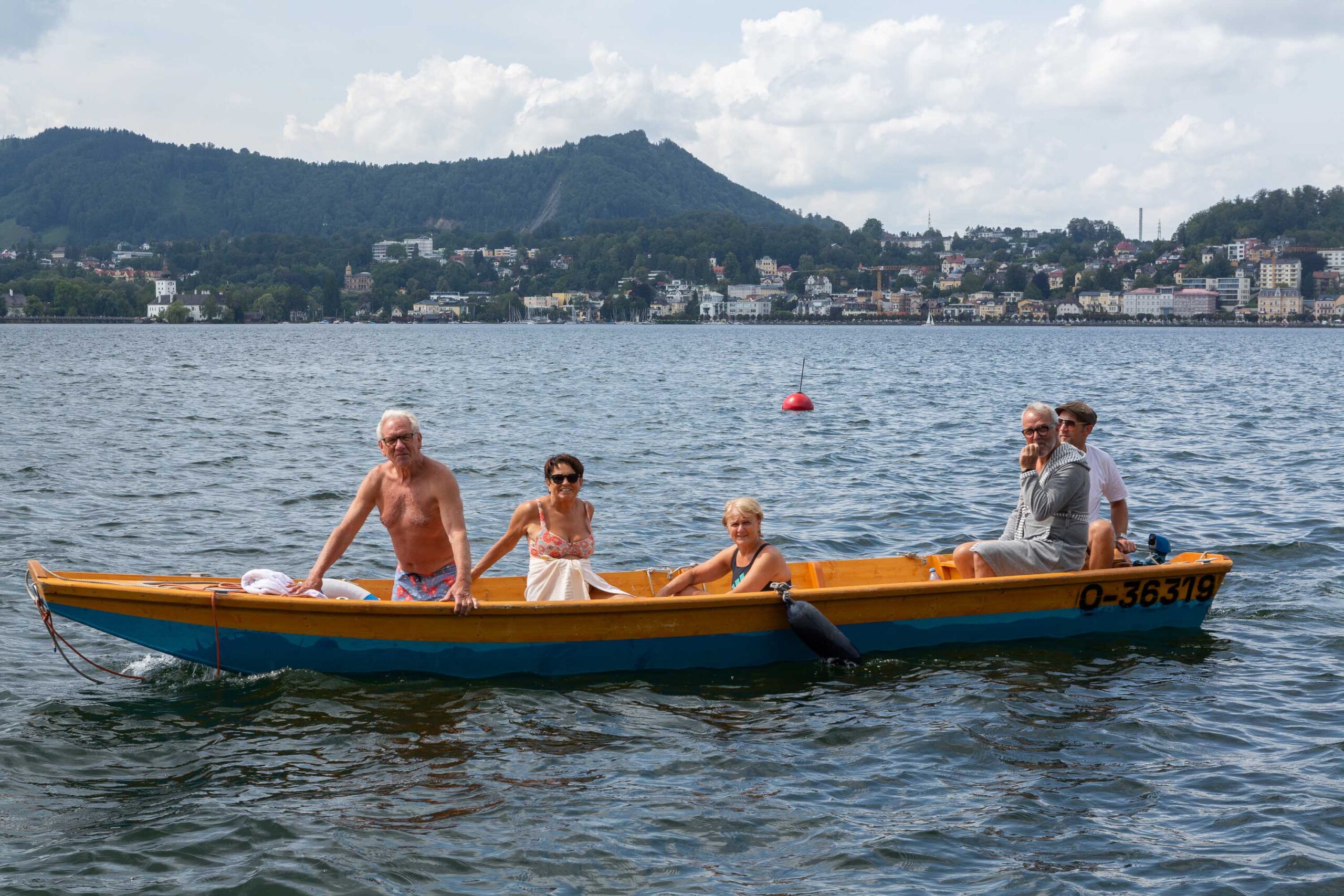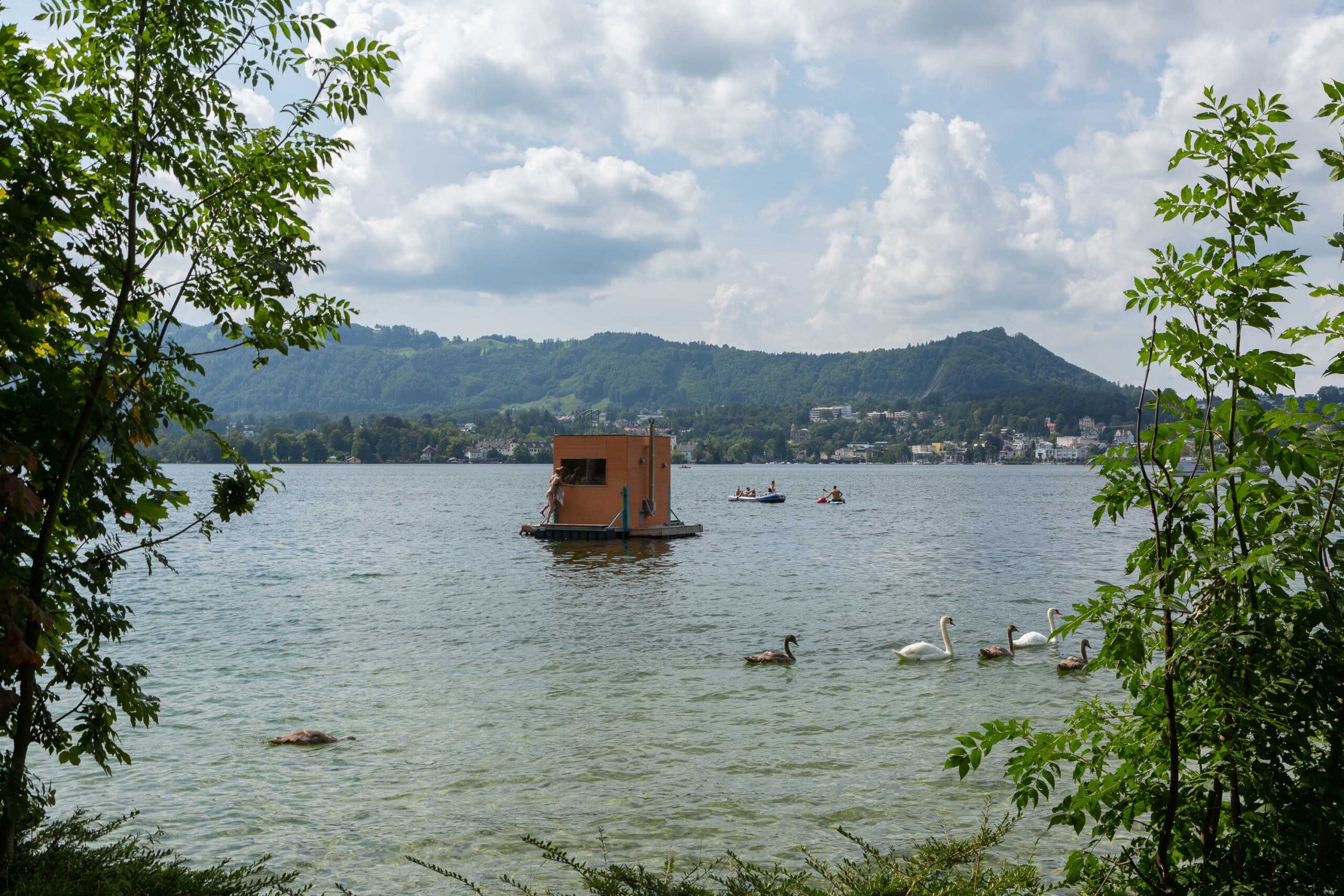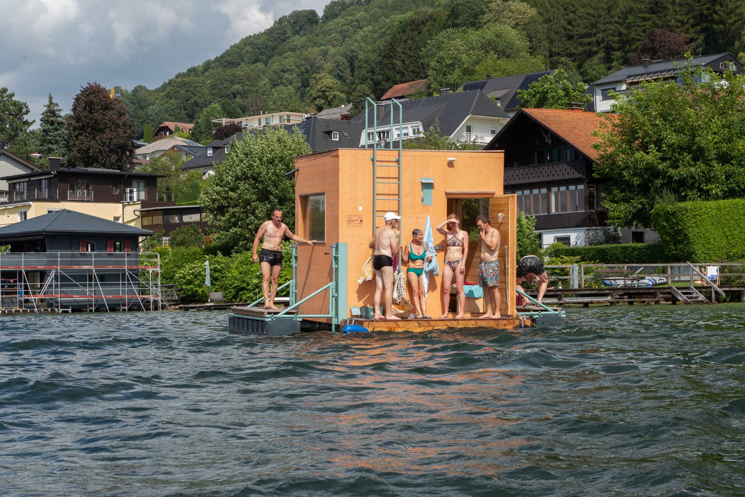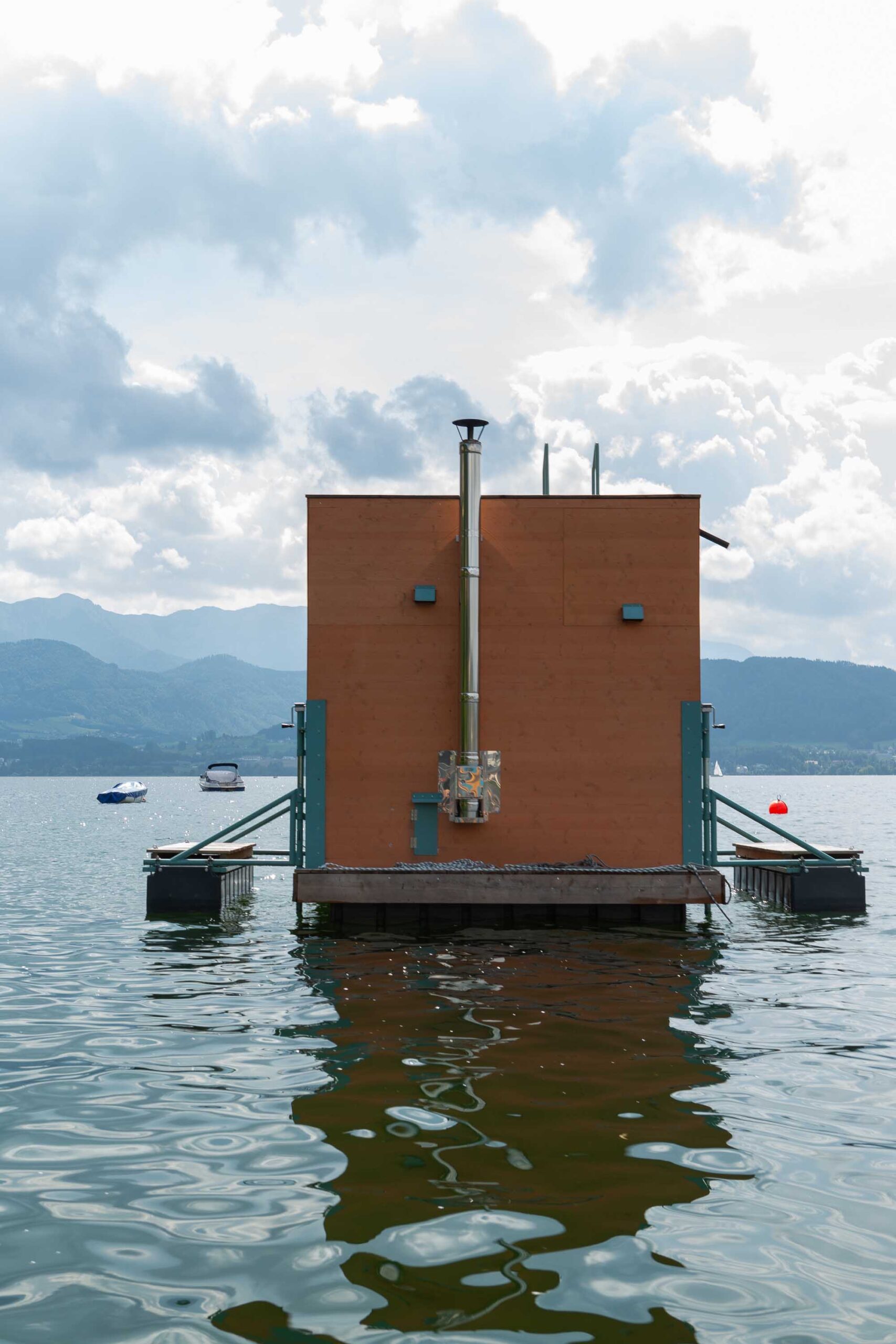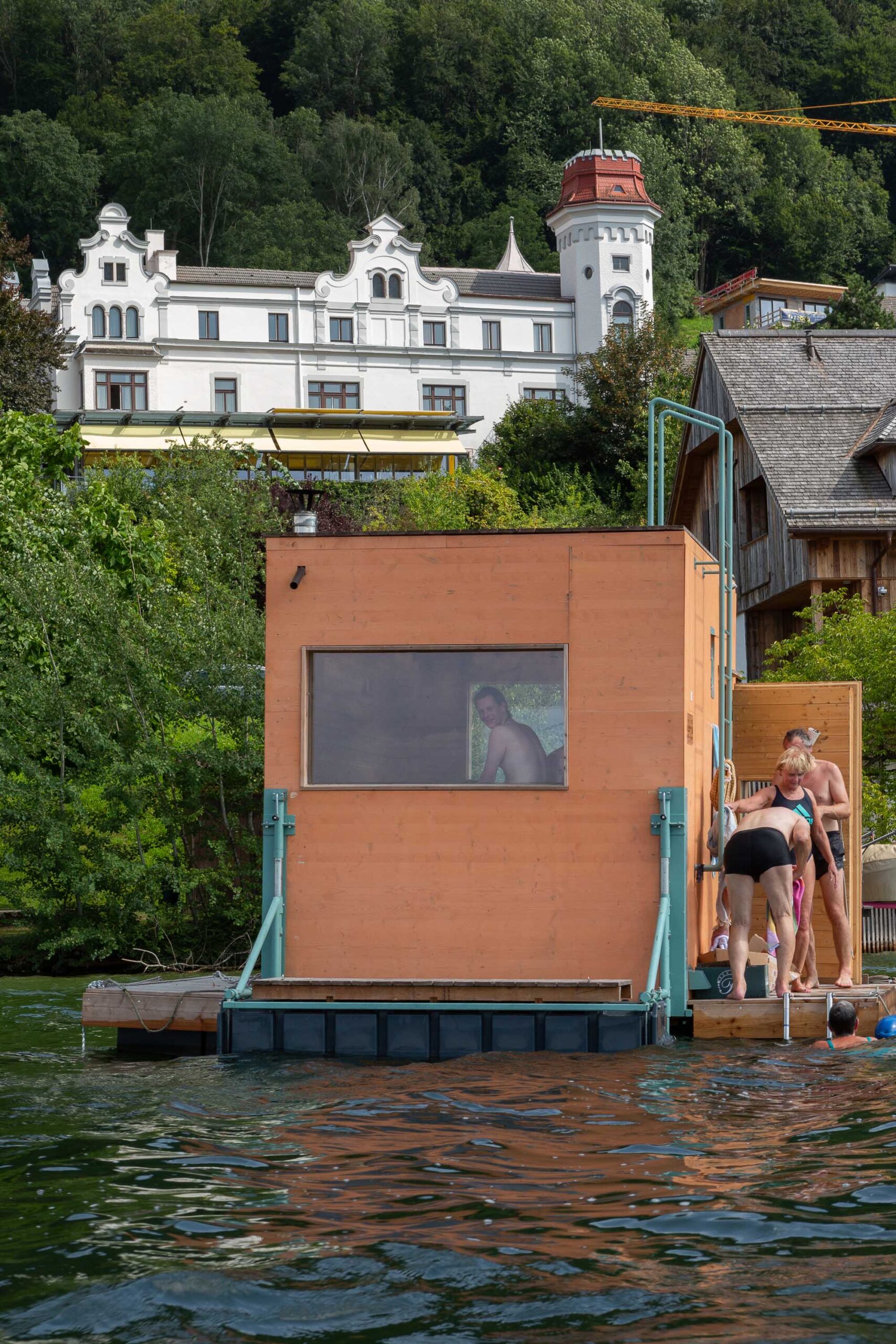 Noch kühlt der See an heißen Tagen. Aber was, wenn die Temperaturen stetig steigen? Blickt man auf Wasser und Berglandschaft, so scheint alles so wie immer zu sein. Doch der Schein trügt. Hänge rutschen, ganze Felsen brechen ab, Wiesen vertrocknen, Schnee bleibt aus, und im See macht sich eine dissidente Muschel breit. Bevor alles ins Kippen gerät, bitten wir in der heißesten Zeit des Jahres in der schwimmenden Sauna zum Klimatalk. Vielleicht, so die These, versetzt uns die zusätzliche Hitze so leibhaftig in ein Schreckensszenario, dass sofortiges Handeln angesagt ist. Anstelle tatenlos noch mehr CO2 in die Luft zu blasen, gießen wir uns also so lange auf, bis wirklich alle verstanden haben, wie heiß und feucht es bald sein wird, wenn wir nichts tun. In der Sauna diskutieren Gewässer–Ökologe Philipp Schubert-Zsilavecz und Künstler Markus Hiesleitner mit all jenen, denen ein gutes Klima am Traunsee etwas wert ist.